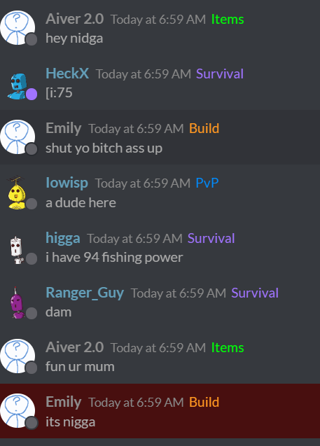 Emily - Racism and profanity (B, A, N words) - Ban: /ban -u “Aiver 2.0” -r “Racism and profanity” -s “build”