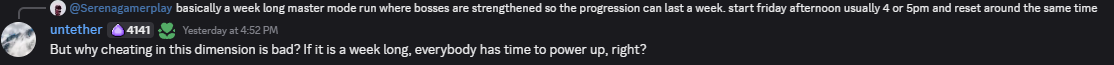 Now about the source of the cheats. I tried to find cheats online, but did not succeed cus I have an iPhone but I am a low level hacker, focused on binary exploitation and so I know the assembly programming language. I decided to reverse engineer terraria and find the instructions that decrease hp. I found them, made the do noting and re-assembled the binary and wow, it really worked. After that I stopped dying (almost, cus there is still a way to kill my character in game), and then (it was september 2025) I found your awesome server. I really loved It, I was playing Zombies and today I decided to go to survival for the first time and immediately was caught with cheats :((( I know it is bad, I know it may really annoy other players and I am really sorry for this, but please, understand my pain of playing without this modifications. I am playing terraria for 9,5 years for now and I really love this game and its community. I hope you will be loyal with this incident, I will try my best not to use the cheat, but it is likely to be impossible. I promise, when I will buy a new phone I will stop cheating and will play just like others.