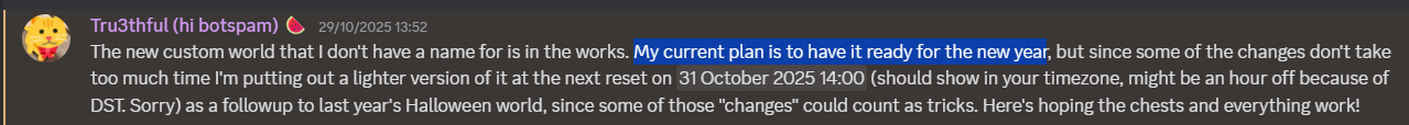 I briefly talked about the next “full” custom world I was working on on the Discord server back near Halloween with a note of when I was hoping it’d be done. I even felt confident enough to later put down a date (the first reset of the 2026, 3 days from making this):