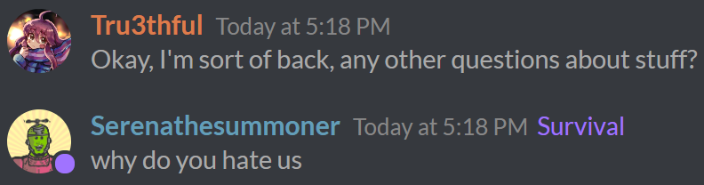Though, since I barely talked about it all, here’s a couple screenshots showing stuff to expect, one showing one of the builds (thanks to @SolarDeity for an initial reference to use, not this screenshot) and 2 more showing reactions to what happened the last time.