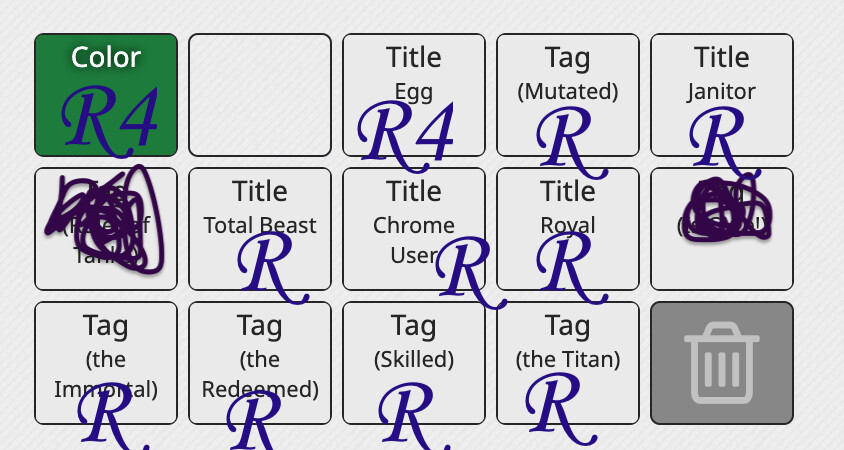 for some reason it didn’t show the number for rarity , but the immortal is R9, the redeemed, Total beast and Skilled are all R7, the Titan, chrome user, and Royal are R6, mutated and janitor have been replaced by wannabe and person, which are both R3.